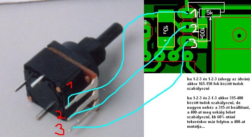 Elkélne a gyors segítség. Igaz, még nem találtam ki, mi a gond a vezérléssel, miért füstölt, de már van még egy gond. Amit múltkor is említettem, hogy a potival nem lehet igazán szabályozni. Csináltam egy ábrát, az eddigi poti bekötési próbálkozásaimról, 2 volt. Remélem világos lesz, mi a gond, és segítetek jól bekötni a potit. Pedig azt hittem mindegy hogyan kötöm a potit. Eddig úgy tudtam, hogy az egyik szélsőt a középsővel 1 helyre kötöm, és másik szélsőt földre húzom.. Itt 3 megy 3 helyre, és úgy néz ki , kombinációként máshogy szabályoz. Segítetek, hogy hogyan lenne helyes?