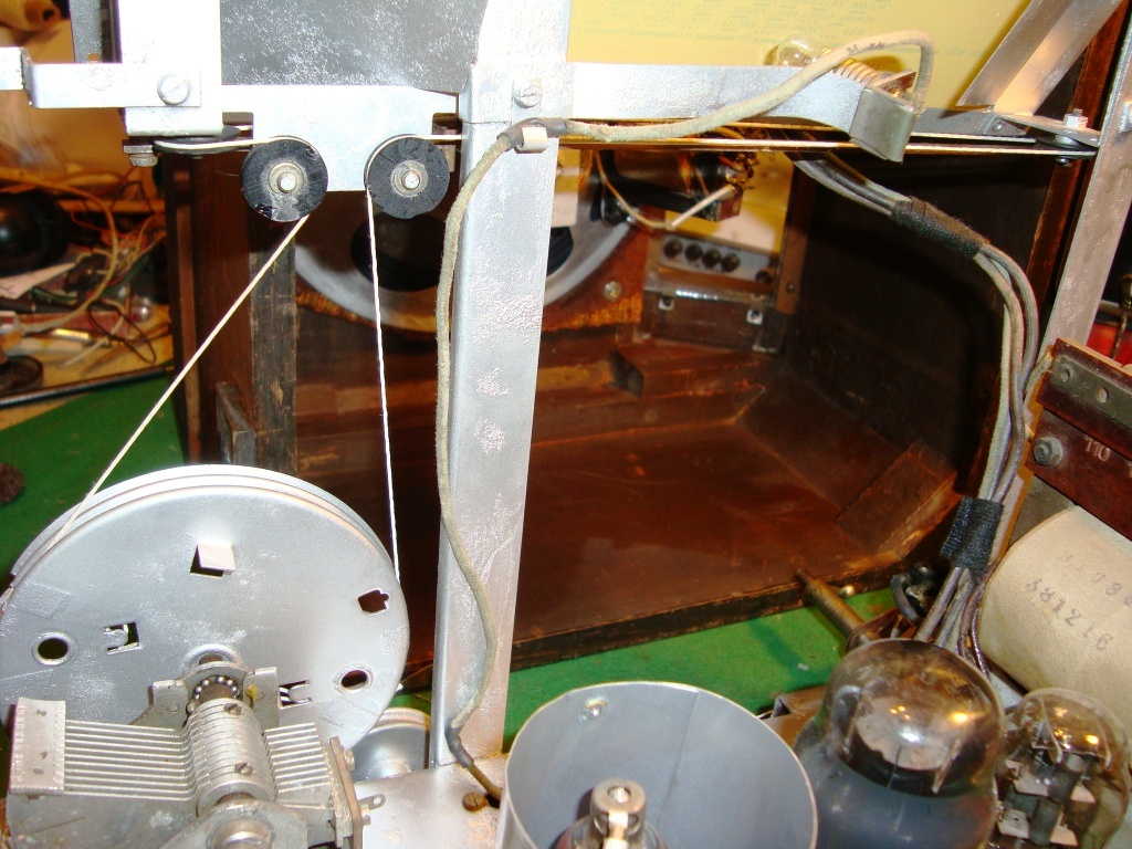Szia. A skálahúrozás viszonylag logikus, a dobról 1 húr megy a meghajtó tengelyre menetirányban, és egy húr megy a skálamutatóra a két hátsó görgő segítségével, szintén menetirányba, vagyis a húrok sehol sem keresztezik egymást.