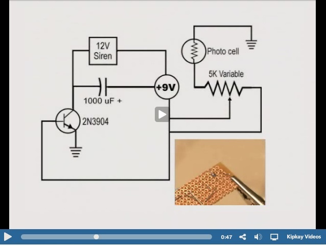 5k ohm -os (ha nincs akkor 4,7Kohm-os) potenciométer, vagy trimmer poti Valamilyen fényérzékelő ellenállás (LDR) 9v-os feszültség forrás (elem, vagy labortápegység) 12V-os csipogó vagy sziréna. (Ha jól látom, beépített gerjesztő áramkörrel.) Tranzisztor:BC337 Bővebben: Link Elkó: Bővebben: Link LDR: Bővebben: Link Csipogó: Bővebben: Link Poti: Bővebben: Link (Trimmer: Bővebben: Link )
