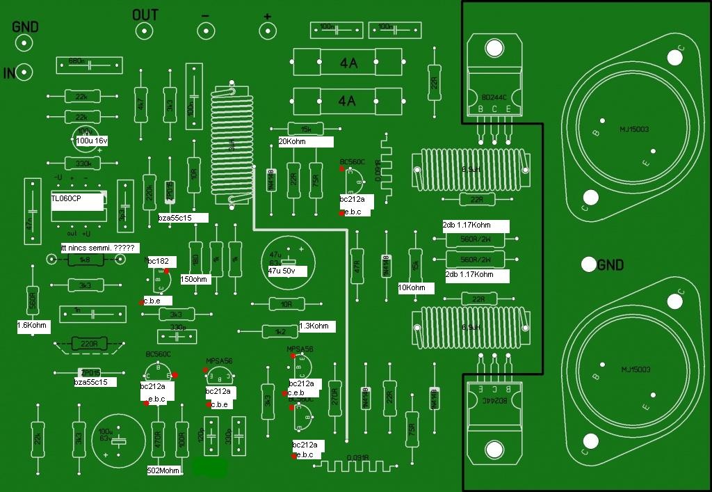 Üdvözlet mindenkinek.A mai estét rászántam a panelre.Átnéztem hatvanhatodik alkalommal,ellenőriztem,hogy van-e forrasztási hiba,kiforrasztottam a diódákat,kimértem,visszaforrasztottam,ellenőriztem,hogy jól vannak-e beültetve.. Adtam neki tápot.Az su-k eltávolítása után szintén megvolt még a + oldali áramfelvétel,a tápágakba bekötött izzó bizonyította.A tápfeszültség - oldalon 37.3 volt , +oldalon 3.2 volt . Eltávolítottam a bd242c meghajtókat is,akkor már a tápfeszültség - oldalon 47.5 volt és + oldalon 31.1 volt. A bd242 eltávolítása előtt mértem itt ott véletlenszerűen,az összes bd560 lábán tudtam mérni 1.5 és 3.45 voltot a nullponthoz képest,az bc 182 szintén. A műveleti erősítőnél találtam +15 voltot, és - 5.2 voltot a nullponthoz képest.Szóval a szerény,és tudatlan agyam azt mondja nekem,hogy ezek után a mérések után ez a panel egy rejtett anomáliát tartalmaz,és azért került fel vaterára,és azért nem kaptam mellé trafót,ha véletlen megcsinálnám,akkor se tudjak reklamálni,és lehessen rám tolni,hogy szakértelem hiányának eredményeképpen ez lett,ill az eladónál még működött. Szóval ennyi..