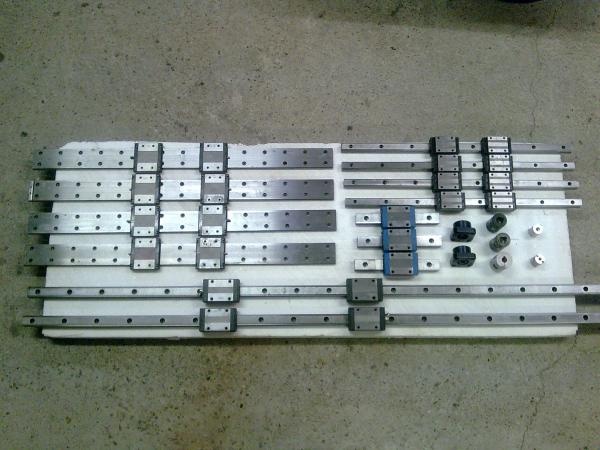 Az asztalt 590mm sin THK RSR15WV kocsikkal lenne megoldva. A sín az asztal alá szerelve a kocsik pedig állnak fixen. Tehát a sín mozog. Így az asztal kevésbé tud deformálódni, főleg ezekkel a sínekkel. Másik előny hogy a forgács nem hullik a sínre. A kép bal felső részén lévő 4 db egyforma sínből vettem 2 db-ot az lesz az asztalhoz.