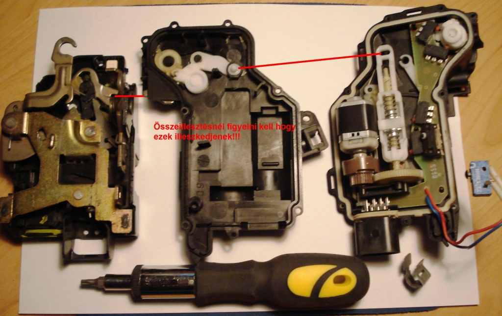 Szia! Akartam mondani, hogy az előző oldalon ITT részletes leírást és linkeket találsz erről a problémáról. Ha az eltérő típusú mikrókapcsoló beépítése volna gond, (mert azt 5 500.- és 7 500.- Ft-t adják javítókészletben) akkor majd készítek egy rajzot a karos mikrókapcsoló beépítési megoldására. A kapcsolóban lévő furatok nem fognak megegyezni a zárszerkezeten lévő furatokkal, melyek speciális öntvényfülekkel rendelkező eredeti kapcsolón ki voltak képezve és ezekbe illeszkedtek. semmi gond, mert a beszerelésre alkalmas kapcsolót kettő darab lemezcsíkkal (ami az illesztőfurat átmérőjének a szélessége, hossza pedig a beillesztés után méretre vágandó) a megfelelő pozícióba lehet állítani a biztos kapcsolás érdekében. Ez a része kb. 10percet vesz igénybe a javításnak, a többi az az ajtó szétszedésén és a zárszerkezet kiszerelésének az időigénye, ami kb. 45perc (csak a szétszedés!). Bárhol elakadnál a szerelésben, csak szólj nyugodtan, segíteni fogok.