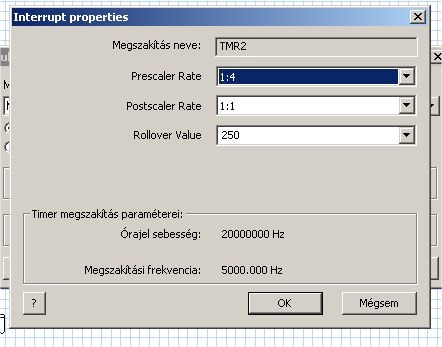 Fosc = 20.00 MHz, a timer2 bemenetére Fosc/4 megy Fosc/4 = 5MHz. Ha a timer2 előosztója 4 -et oszt (T2CKPS<1:0>: '0b01') és a timer2 maga 250 -nel (PR2 = 249), akkor timer kimenetén 5 MHz / 1000 = 5kHz = 5000 Hz -es jel jelenik meg. A megszakítást kérő jelet az otóosztó (1..16 közötti osztással) kimenete adja. Ha az utóosztó osztása 1, akkor 200us, ha 10 akkor 2ms időközönként kérhető a megszakítás.
