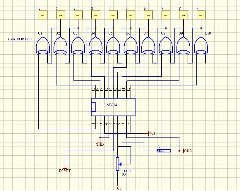 Lehet sejteni mit szeretnél, de át kellene gondolni. - Az LM3914 kimenetén áramgenerátorok vannak. Ha ezt logikailag fel szeretnéd dolgozni, a kimenetére felhúzó ellenállás kell. - Az IC-nek van DOT üzemmódja, mikor mindig csak egy kimenet aktív. De az aktív kimenet "logikai szintje" "L". (Gondolom ehhez lenne a kazal XOR.) - A kijelző lábait nem kehet így összekötni, a "mátrix" pontjaiban dióda hálózat kell. - Az LM nem tud meghajtani 8db szegmenset egyszerre, vagy is igen nagy fényerő különbség lenne "1" és "8" kijelzése esetén. Vagy is minden meghajtó kimenetére meghajtó tranyó kellene, vagy a hét szegmenshez külön-külön, és a mátrix a tranyok előtt lenne.(minden szegmenshez áramkorlátozó ellenállás is kell) - A bemenetnek (potinak) nem adtál tápot, annak az IC referencia feszültsége kell. De a referencia terhelése, egyben meghatározza a kimenetek áramgenerátorainak áramát is. Jelenleg 1,2V lenne a referencia, 320ohm terheléssel már 38mA lenne a kimenetek árama. - Egyébként is az a gyanúm, hogy a nyomásérzékelő nem egy poti, hanem egy változtatható ellenállás, aminek értéke változik 0..320ohm között. Vagy is nem lehet belőle feszültségosztót készíteni az LM számára így egyszerűen. üdv! proli007
