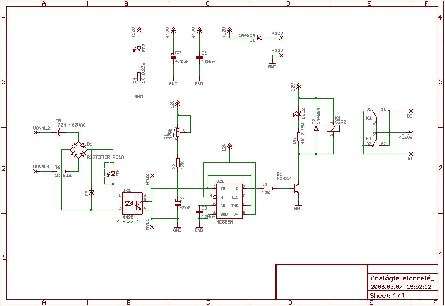 24V-ton a vonalat 3.3mA, mig 50V-ton 6mA-val terheli a vonavat csengetéskor. A csengető impulzus megjelenése után a relé meghúz. Az elengedéi idelyét az NE555-ös integrált időzítövel kialakitott újraindítható MMV állítja be. Az időzítés értéke a megydott alkatrészekkel 3-25 másodpec melyet a trimmer potenciométerrel lehet beállítani. Az első elkébzelésem egy kicsit módositottam a stabilabb működés érdekében, de még ígyis elfogadhtó az árfekvése. |