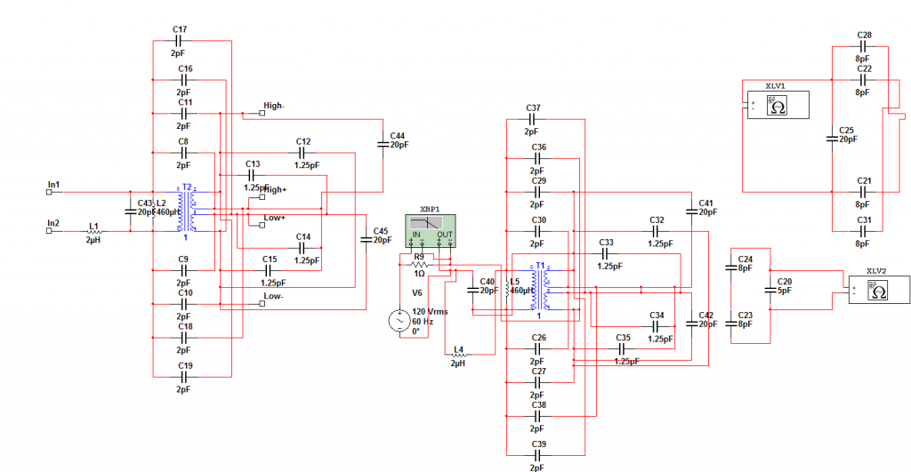 - Amikor mérig a 8,48 pF-et akkor a tekercs két vége rövidzárnak tekinthető? Ha ez igen, akkor a primer-szekunder tkercsközit kapacitást én 8pF-nek, a primer-primer tekercs közti kapacitást 5 pf-nek becsültem. Ezzel az ábra szerinti méréseim szerint kijön a mért adat. - amikor mérik a 28,66 pF-et, akkor léynegében mérike gy tekercs két vége közötti kapacitást, plusz a hozzá adódó tekercsközti kapacitásokat (a másik két tekercs rövidre van zárva, ezért azoknak két vég közötti kapacitása kiesik)? Ha igen, akkor egy tekercs két vége közötti kapacitás önmagában 20pF 8a maradék 8pf meg a tekercs közti kapacitásokból jön hozzá. Na nézd meg a mellékelt ábrát. Így kijön a 8,48 pF és a 28,66pF. Megmértem a rezonanciafrekvenciát, ami így 705 kHz volt a bode plot szerint. Tehát még valami nem teljes: röviden vagy az induktivtiások vagy a kapacitások kisebbek. Ha ezt veszük ezzel a 8pF, 5pF és 20pF értékkel már számlhatok, mert ennél ezek csak kisebbek lehetnek. Ezek után ezt fogtam és szétosztottam úgy, hogy minden kivezetéstől minden kivezetéstől legyen valamennyi? Korrekt -e így ez a szétosztás szerinted? Ha igen, akkor lényegében megvan az a modell, ami szerintem már elég korrekt ahhoz, hogy a számomra lényeges elemekkel számolhassak.