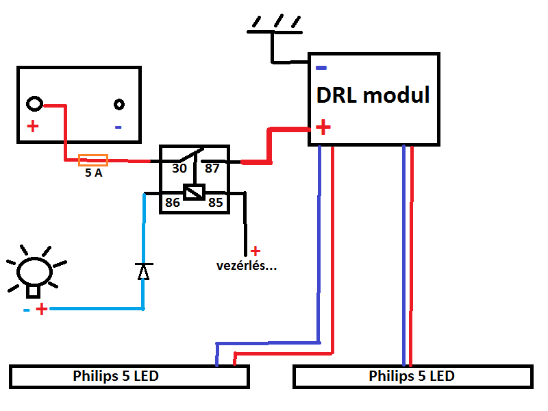 Egy kérdésem volna, a napi szinten ezzel foglalkozó emberkékhez! Adott egy Philips 5 led-es DRL (nappali menetfény, Philips 5 LED DRL), Az hozzátartozik, hogy a modul a DRL testeket 19V-al táplálja! Szabályosan bekötve, modullal rendelkezik, viszont a tiltószál nem működik valamiért, illetve a feszültségérzékelése sem, tehát ha áramot kap világit folyamatosan, már lassan egy éve működik, ez a rész kipipálva! A modult 4 lábú ködlámpa reléről vezéreltem meg, aminek a tekercse egyfelől a generátor gerjesztő száláról kapja a pozitivot, (generátor felgerjedése után) a negativot pedig a helyzetjelző pozitivjáról, ami kikapcsolva negativ, helyzetjelzőt kapcsolva pedig pozitiv lesz. Így tehát már helyzetjelzőt kapcsolva leold a relé és elalszik a DRL. Az az ötletem támadt, hogy meg szeretném oldani úgy, hogy helyzetjelzőre / tompitottra ne lekapcsoljon, hanem gyengített fénnyel üzemeljen tovább! Tudna valaki javasolni egyszerű és olcsó kivitelezhető megoldást? Egy ötletem van nekem is, de hátha valakinek jobnb elgondolása lesz! tehát: Jelenlegi kapcsolás igy van: A (+) vezérlés a generátorról jön, ha jár a motor. Arra gondoltam, ha működne, lenne egy plusz 4 lábú relé, amin a 86 fix negativ, 85 a helyzetjelző pozitivja, 30 az akkura, 87 pedig a drl lámpatestekre közvetlenül, illetve a drl-ek negativját fix testre tenni. Így elgondolás szerint a helyzetjelző felkapcsolásakor a DRL modul tápja megszűnik, ami 19V-al táplálta a lámpatesteket, a második relé pedig akkufeszt enged a lámpákra (12-14.4V) a modult megkerülve. Ebben a történetben még kérdések vannak: - 14.4V-on eléggé csökken a fényerő? - A DRL power ledek birják az üzemi feszültséget, ami esetleg ingadozik 1-2 V-ot? - nem gond, ha a modul után a DRL lámpatestekhez menő kábeleken a testet fixre teszem? Köszönöm a választ! ez van jelenleg: Bővebben: 5 LED Philips video Szerkesztve, nem versíró fórum vagyunk, a felesleges 20 entert kivettem. A hozzászólás módosítva: Nov 16, 2012