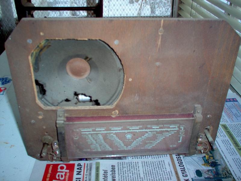 Az enyém is R325 kissé nehézkes beazonosítás alapján. A hangszóró nekem hibátlan de már nem a gerjesztett típus mint írtam. Betettem egy 1,5kohmos ellenállást a kondi közé, be is indult gerjed mint az állat. Igaz találtam 2 leszakadt kondit, meg egy raklap széthasadozott szurkos kondit. A csőfoglalatokon is fekete koromszerű por van az érintkezőkön, olyan mintha az ezüstözés elbomlott volna rajta kissé kénes levegő hatására. Szerintem az egészet újra fogom horganyozni. A skála mögött neked miért piros a háttér?