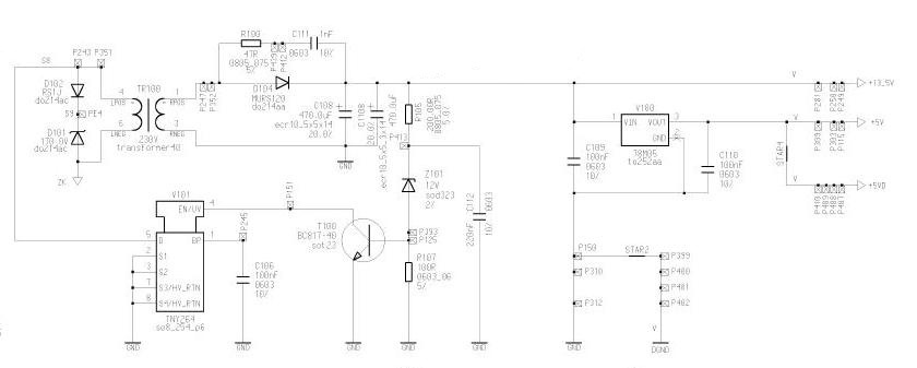 A primer oldal nevű képed szerintem pont hogy a szekundert mutatja. A szimpla 230 oldali kondi, és az 1 db kapcsolótranyó/FET, valamint csatolt szekunder fojtó hiánya arra enged következtetni, hogy ez egy flyback táp, készenléti táppal. Amit te primer oldal nevű képre tettél, az szerintem néhány lineáris stabilizátor a szekunder oldalon.