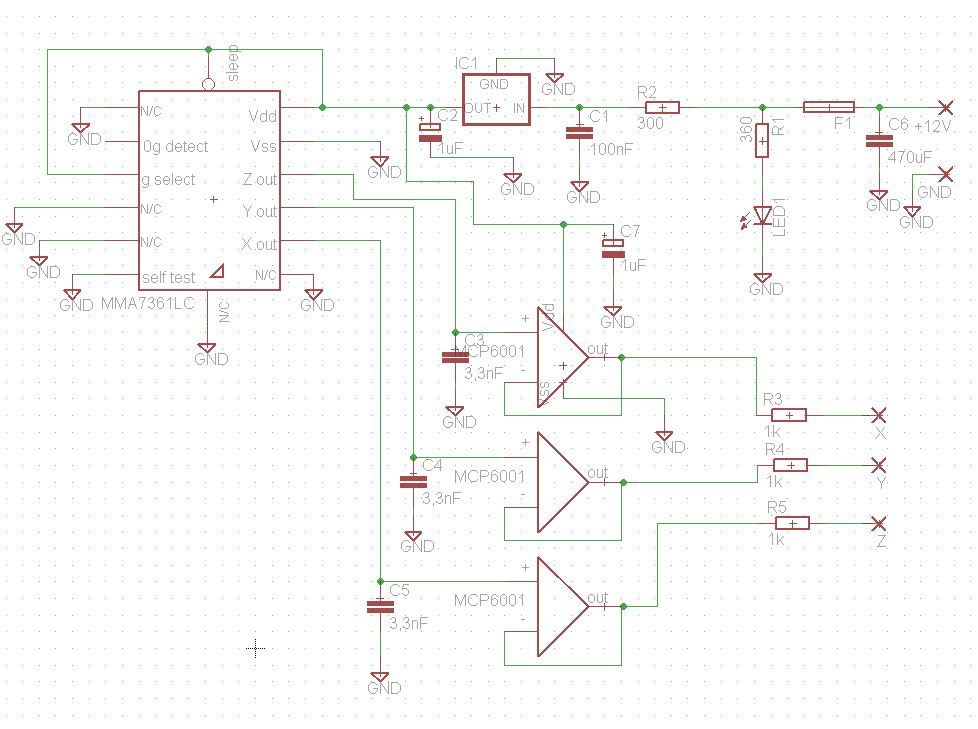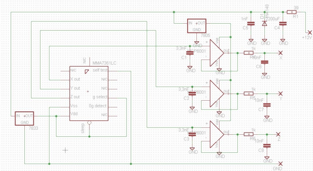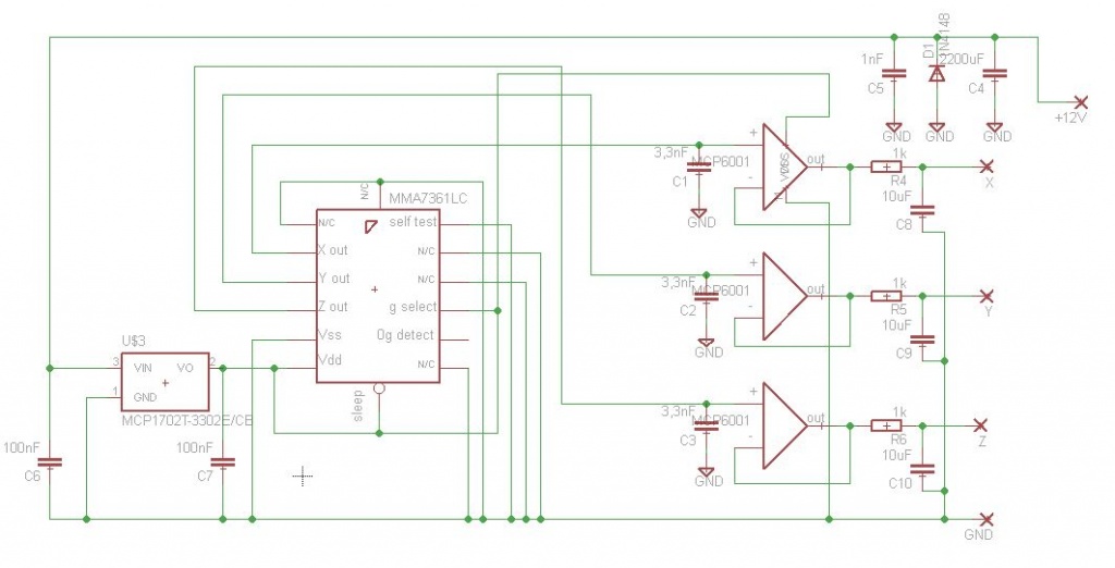 Ez lenne a végleges kapcsolásom. Kérlek vess rá egy pillantást. Volt olyan tapasztalatom , hogy mikor csak simán teszt jelleggel ráadtam a gyorsulásmérőre a tápot akkor hirtelen elkezdett melegedni és elment a kimenet mintha zárlat lett volna. De a táp 3V volt , a kimenetén volt csak egy multi. Ez mitől lehetett ? :S Aggaszt a jelenség. |