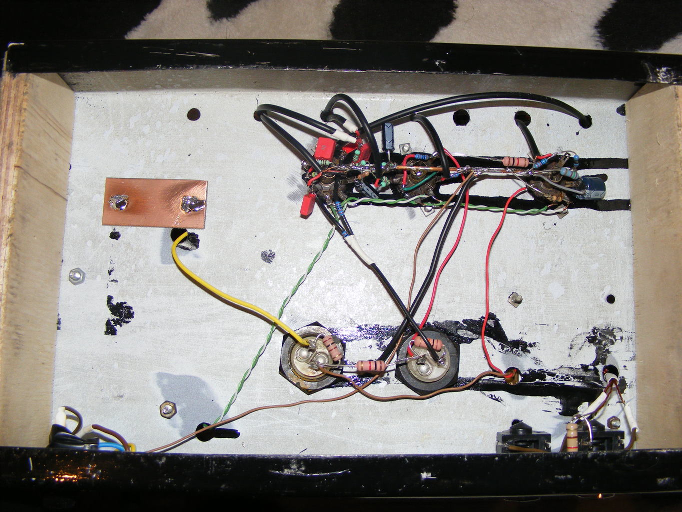 A potik és a kapcsoló azért lóg, mert egy fém lapra lesznek felcsavarozva (Orion 520a dobozba, a fém lap a skálaüveg helyén lesz), a fűrész lap csak azért van a potiknál, hogy egyben legyenek, ne lógjanak mindenfelé.