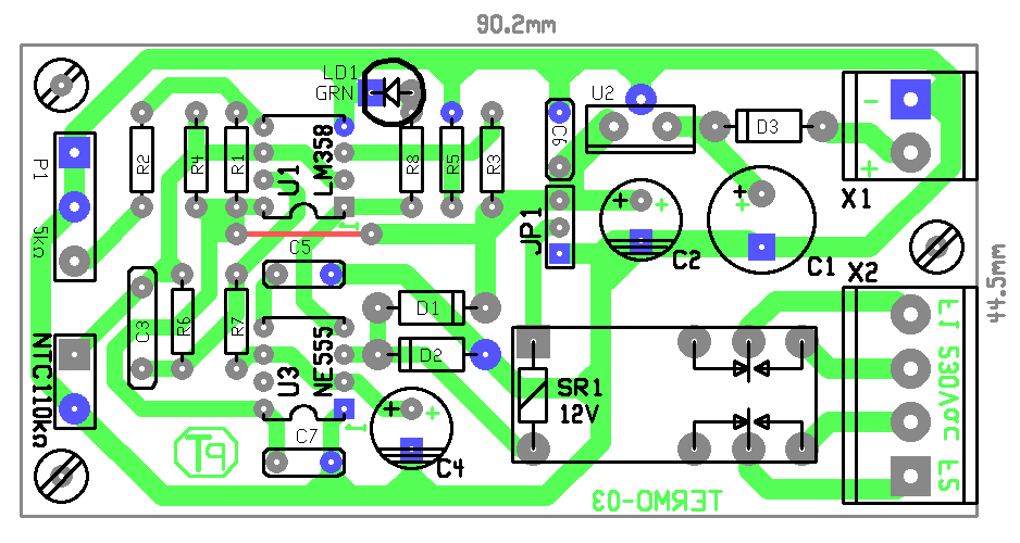 A kérés nem éppen a "Profi szobatermosztát" témakörébe tartozik. A múltkor hirtelen felindulásból rajzoltam egyet. Ha érdekel közreadom, de ki (számomra természetesen) nem próbáltam, viszont viszonylag egyszerű. Igaz, nem PTC, hanem NTC-vel működik. De.. - A komparátora, ne egy visszacsatolt OPA, hanem azt, az 555 biztosítja és egyben meghajtja a relét. - Az 555 előtt lévő R7-C4 integrátor biztosítja, hogy ne tudjon "gyorsan" ki-be kapcsolgatni. Hogy kímélje azt amit vezérel. - Az U1a a mérőhíd átlófeszültségét erősíti. A hiszterézist tulajdonképpen az 555 küszöbfeszültsége (Ut/3) és az OPA erősítése határozza meg. Az erősítést és ezzel a hiszterézis nagyságát lehet beállítani R6 ellenállás értékével. - Az U1a C3 kondenzátor integrálja a bemenő jelet, ezzel kiszűrve az esetleg menetere ülő váltófeszültséget, ami csökkentheti a hiszterézist. De eben segít az R7-C4 is. Így nem "kerreghet" a relé, ami általános hibája szokott lenni egyszerű komparátoroknak az átváltás közelében. Az U1b egy segédáramkör, amely figyeli az NTC vagy vezetékének szakadását, és letiltja az 555 működését ennek fellépése esetén. - A híd R1/R2+P1 és R4/NTC tagokból áll. Mivel a felső két ellenállás egyaránt 10kohm, az átváltás akkor történik meg, mikor az R2+P1 értéke megegyezik az NTC hőfok által befolyásolt értékével. NTC-t azért érdemes választani,. mert annak viszonylag nagy a hőegyütthatója. Így viszonylag egyszerűen lehet kis hiszterézisű áramkört létrehozni. üdv! proli007 A hozzászólás módosítva: Nov 23, 2012