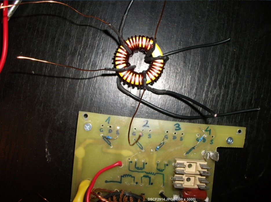 Gate meghajtó trafónak inkább egy másikat választottam, a könnyebb átláthatóság kedvéért. Ugyan úgy 7 menet/tekercs, de most 0.8mm-es huzallal a szekunder, 0.4mm a primer oldalnak (az még nincs rajta a képen). Lábakat csináltam neki, hogy véletlen se legyen az elnéztem mi melyik. A vékony lesz pl pöttyöknél jelölt, valamint a gumival szigetelt tekercsvégkivezetékelések pedig a sima forr.pontok. Szerintem ennyi. Jó lesz-e így?