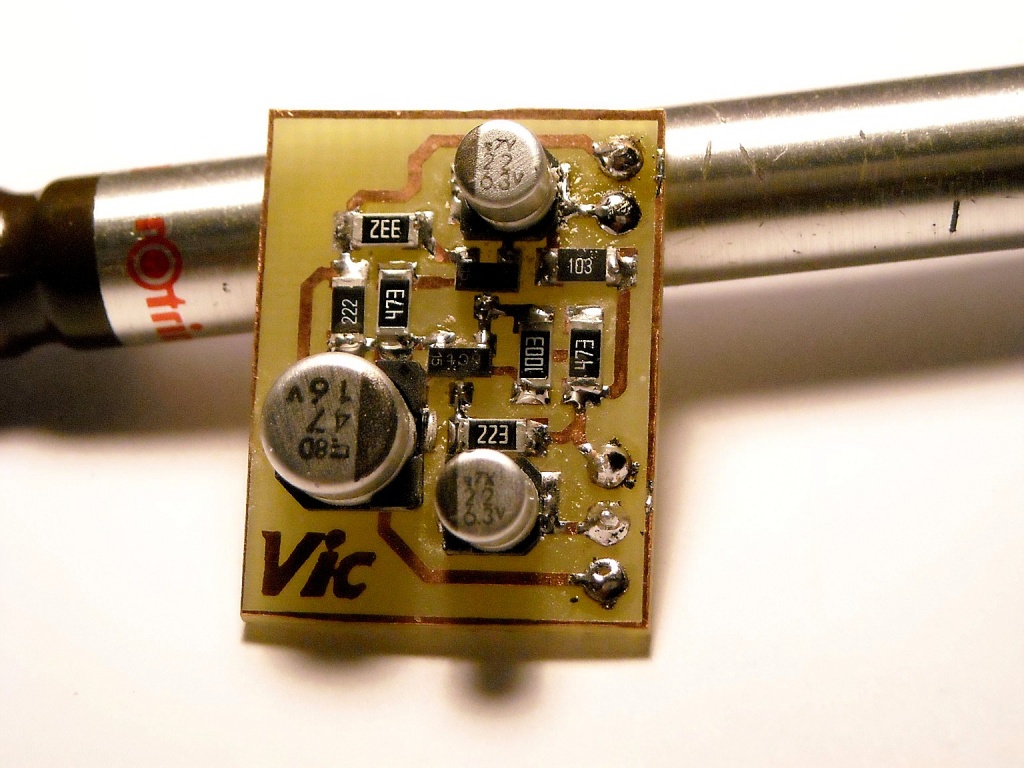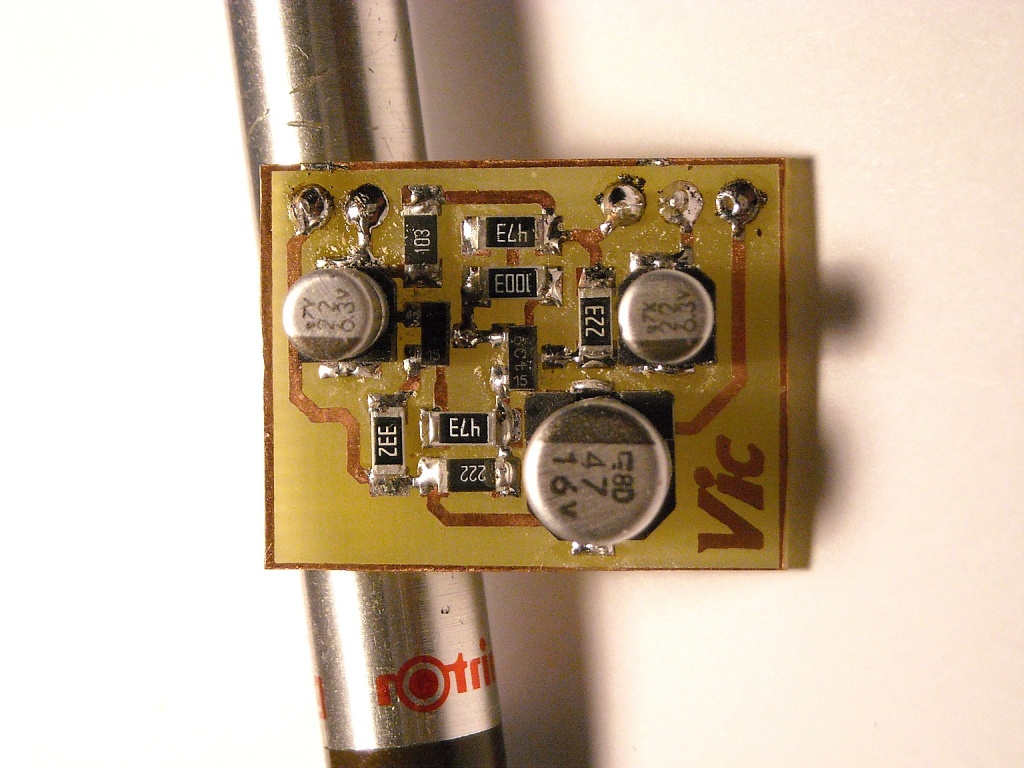 Mikrofon előerősítő. Olyan kicsi lett, hogy a vicsys logóból, csak a Vic fért rá.