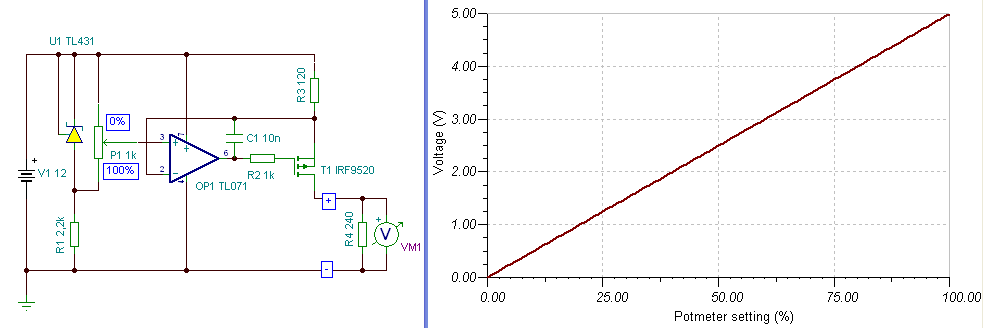 Már pedig annak illik lineárisnak lenni. Nézd meg a Vout képletét. Ott a poti értéke a számlálóban van, vagy is annak változása a kimenti feszültségre lineáris. Persze illene tudni mit is nevezel "lineárisnak", vagy is mennyi hiba engedhető meg. üdv! proli007