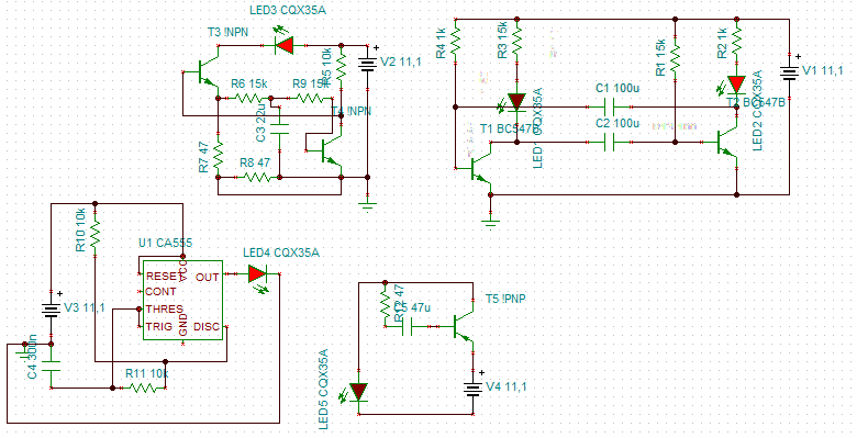 Lehetetlen,ezt úgy kellene írni,hogy Ut.+5V .Ha 5V a táp akkor nagy a ledek előtétje,ettől még a multivibrátor mehet,de az 5V az 1k ellenálláson és a leden nem tud akkora áramot áthajtani,hogy világítson a led,ezért mondtam,hogy csökkenteni kell az ellenállást.