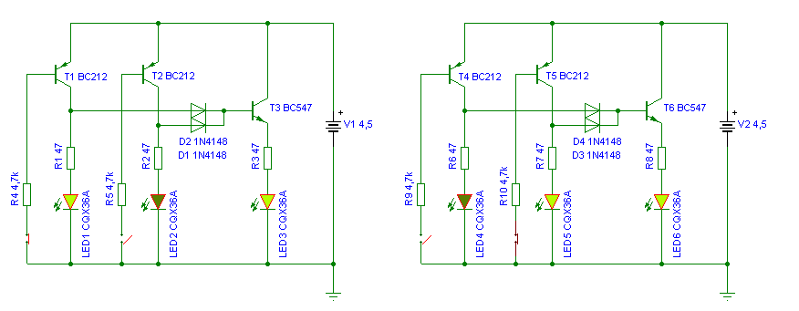 Szia! Úgy csináltam ahogy írtad.Egy BC 547-el."kollektorát a tápra, emitterét a Led ellenállására" aztán rövidre zártam az ellenállást ami a bázison van.De semmi most még annyira sem pislákol. 6,5V -al is próbáltam de ekkor is csak nagyon halványan.A rajzon azt írja hogy 3V-ról működik,amúgy nem tudom meddig lehet emelni. Üdv.