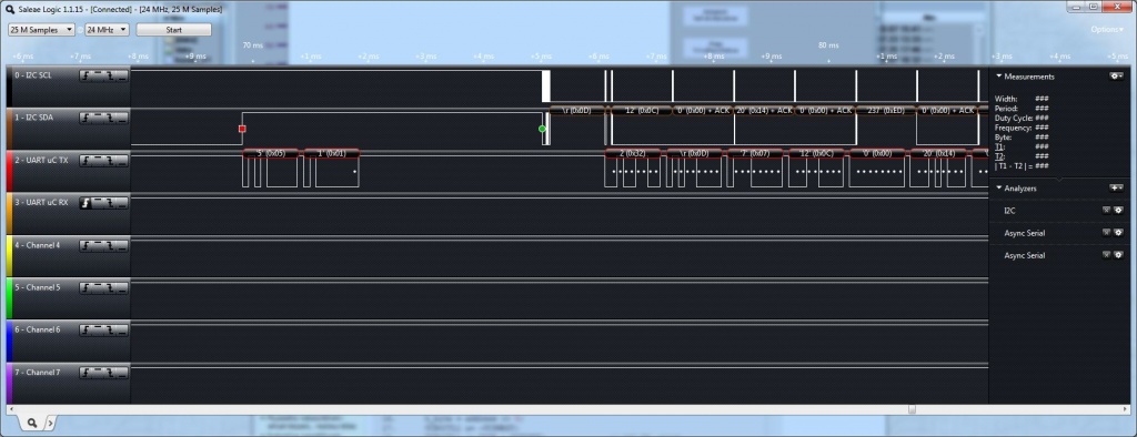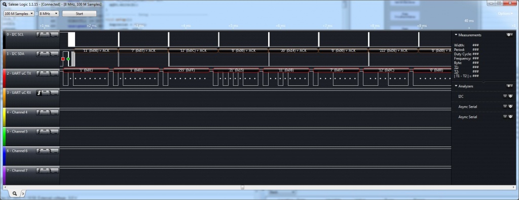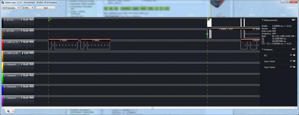 Megnéztem debugg módban a Register/Special Function alatt az UCB0RXIFG-t, és valóban később billen be 1-be. Beraktam egy 1ms-os késleltetést, de nem itt volt a baj! A helyzet annyiban változott, hogy nem 255-öt küldött, hanem mást. A fő gond, nem értem, hogy miért, a 9. sor után volt, illetve oda kellett berakjak egy 5ms-os késleltetést. Tehát, kiküldök az UART-on két bájtot, várok, és csak ezután indítom el az i2c műveleteket. Az analizátor adataiból kiderült, hogy azt a bizonyos két bájtot nem rögtön küldi el, hanem később, és szerintem ebből lett a galiba.