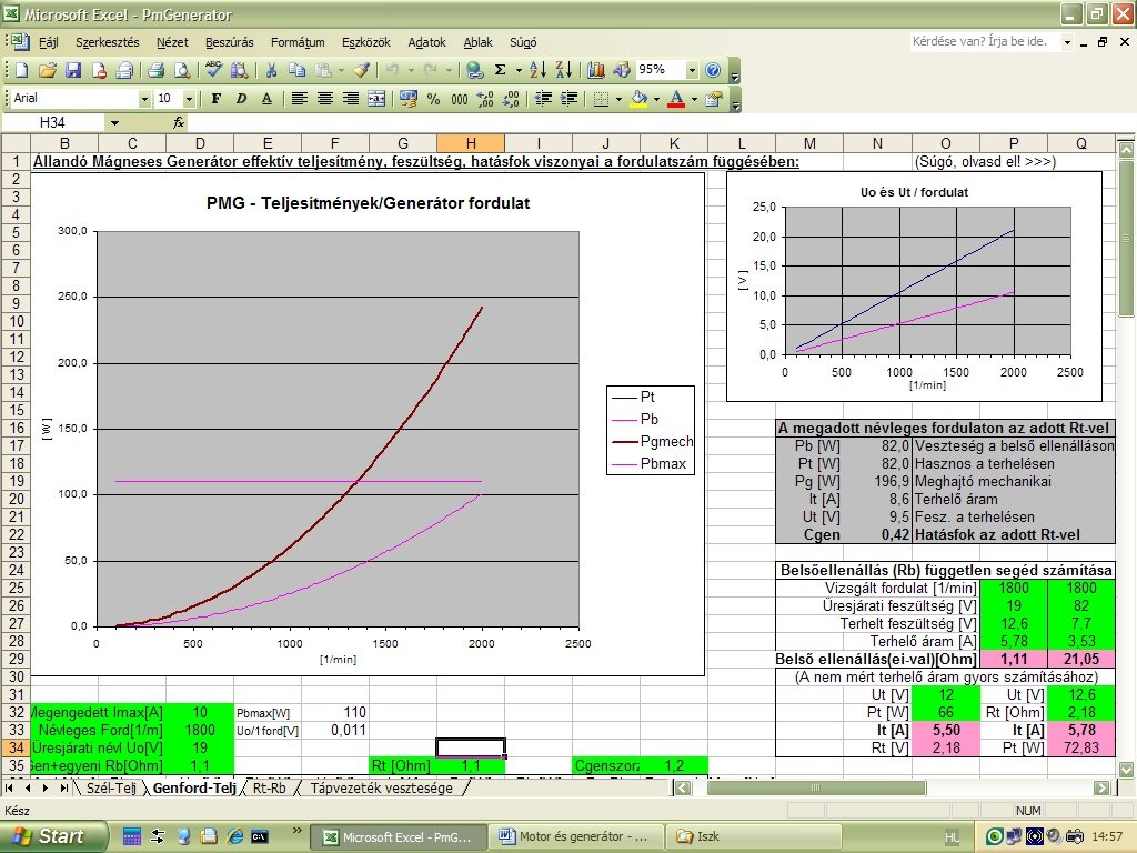 A moziégős méréssel valami baj lehet, mert annyira kilóg a sorból, hogy nem vettem figyelembe. A mérési hibákat és az izzók hőmérséklet függő ellenállás változását figyelmen kivül hagyva: "Motor" - Rb~1,1 Ohm, Pki, max~80 W (ford=1800, Rt=Rb=1,1 Ohm, Ut=9,5 V) "Generátor" - Rb~21 Ohm, Pki, max~80 W (ford=1800, Rt=Rb=21 Ohm, Ut=41 V) A mellékelt képekhez: Minden generátorból a legnagyobb teljesítmény akkor vehető ki, ha a terhelő ellenállás (Rt) megegyezik a belső ellenállással (Rb). Ekkor viszont a gyakorlati hatásfoka kb. 40 %, vagyis ~2,5-szeres meghajtó teljesítmény kell! (gen1, mot1) Javasolt minimális Rt/Rb arány = 5. Ekkor a hatásfok kb. 70 %, már csak ~1,5 szeres meghajtó teljesítmény kell. (gen2, mot2) A max. áram csak hasalt az elfogadható felbontású grafikon képek miatt. Nem ismert!!! A "valamivel nagyobb" motor kefés? Hány pólusú? Hogy van tekercselve (1,2 réteg, hurkolt, hullámos)?