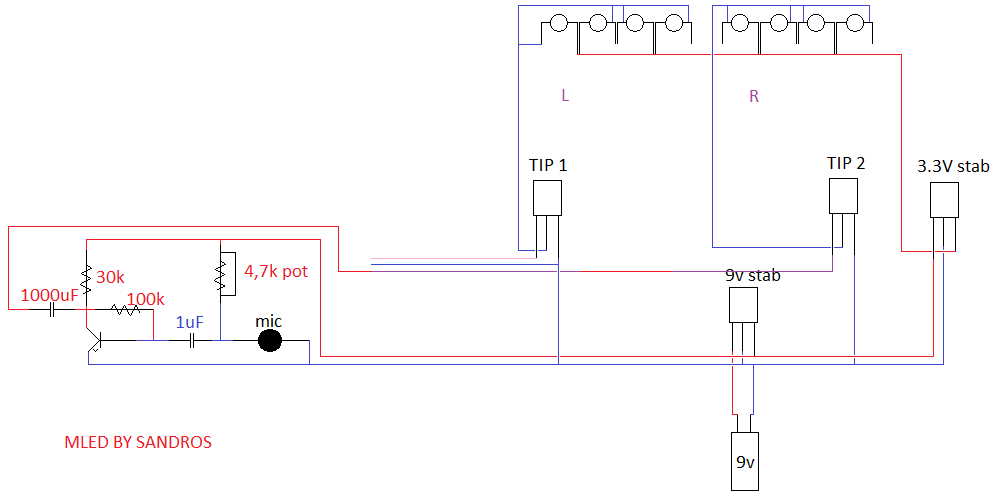 Megépítettem az alábbi kapcsolást, viszont nem működik megfelelően. - nem világít teljes fényerővel egyik led sem, csak ha közvetlenül a 3.3V-os stabIC-re kötöm - nem működik a mikrofon erősítése sem Zenére (audióbemenetről) működik, de nagyon halványan, mikrofonról egyáltalán nem. Mit rontottam el? Mi a hiba a kapcsolásban? (A csatolt videóban több minden látható, elnézést ha valamit nem úgy hívok, ami az valójában, hobbiszinten próbálom csinálni az ilyen dolgokat és még nem tudok sokat.) Bővebben: Link (youtube) A hozzászólás módosítva: Okt 8, 2012