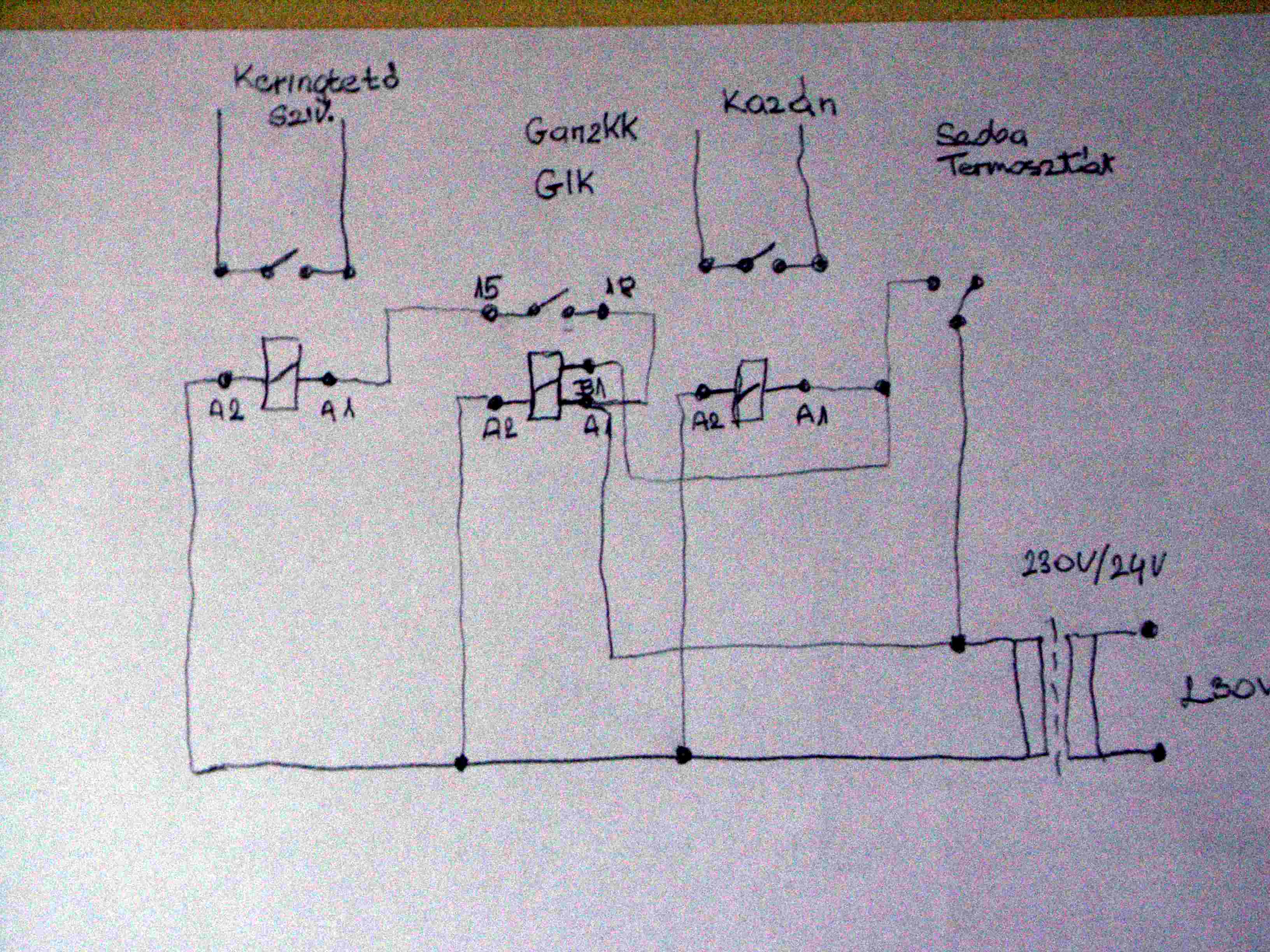A szoba termosztát, ha kicsi a hőfok, indítja a kazánt, és a időzítőt a B1 csatlakózón. ami meghúzza a keringtető szivattyú reléjét, ami ki is hagyható mert a időzítő relé 2A bír. Tehát a keringtető szív. két vezetéke, mehet a GanzKK GIK 15 és a 18 csatlakózási pontba. De ekkor nem kell, az A1 és a 18 pont közötti összekötés. ami a rajzon szerepel. Ha a termosztát kikapcsol onnan kezdi a időzítést, a GanzKK GIK ami be van állítva. Ha a időzítés nem jár le, és a termosztát újra kapcsol, a keringtető szivattyú nem áll le. Ami furcsa a általad adott rajzba: miért ~24V kap a szoba termosztát? A mechanikus termosztátokat ~230V gyártják és van bennük ellenállás, hogy a kapcsolást segítse. Esetleg kettő hogy éjszaka 2-3°C kisebb hőmérsékletet legyen, ezt az elején lévő kapcsolóval, lehet ki/bekapcsolni. Ezt márt meg építettem. Amiért beüzemelés után nem lett használva, a keringtető szivattyú nem índúlt újra. Sok szemét volt a csővezetékbe, és ez meg fogta. Nem elektromosan volt rossz. Azt nem tudom, hogy kitisztították –e, a csővezetékeket, vagy használják -e.