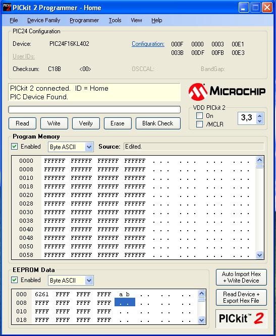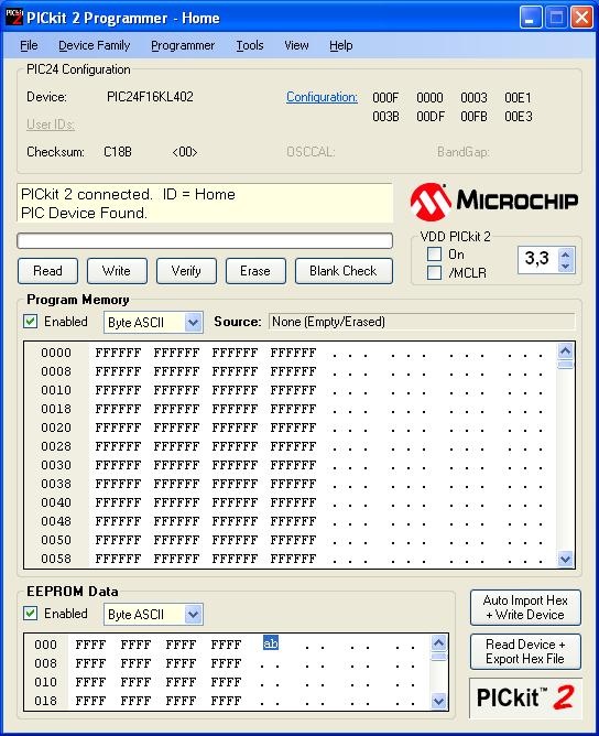 Ha másmilyen gyártótól származik a 24LC01, akkor le kell tölteni a Pk2DeviceFileEditort, be kell olvasni a PICKit2 telepítési könyvtárában levő Pk2DeviceFile.dat állományt (nem árt elmenteni más néven), a PartList -ben meg kell keresni a 24LC01 vagy 24FC01 -et, duplikálni kell, és a másolatot átnevezni, a ConfigMask -ok között a ConfigMask4 -et átírni 3 -ra, elmenteni Pk2DeviceFile.dat néven. A PICKIt2 programot újraindítani.