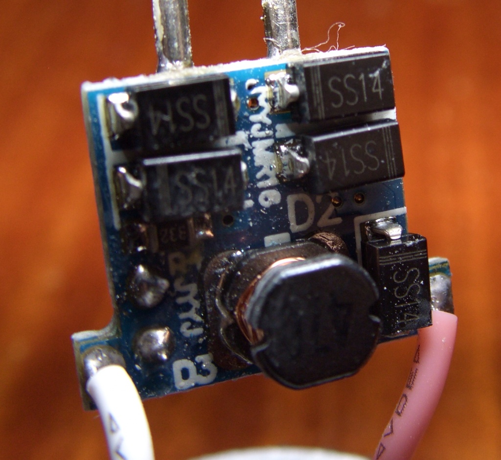 Van egy MR16 foglalatos 3db 1Wattos LED-et tartalmazó LED lámpám (összesen 3Wattos), aminek szeretnék a hatásfokán javítani. 12Voltról működik, de az MR16 az polaritásfüggetlen kiosztás, én pedig polaritásfüggő vezetékre akarom cserélni a lábait így is növelve a hatásfokot, ugyanis túrázáshoz akarok belőle "zseblámpát" illetve reflektort gyártani. Ugye el lehet hagyni ilyen esetben simán az egyenirányító hidat és menni fog ha megtalálom hova kösszem a 12voltom plusz és minusz ágait miután kiszedtem azt a 4 diódát? Másik kérdésem az lenne, hogy a vezérlő áramkörön lehetne-e egyszerűsíteni, hogy még hatékonyabb legyen? Ahogy ránézek valami DC-DC konverternek tűnik de nem tudom minek, a LED-ek akár sorban akár párhuzamosan is mennének 12voltról, csak az áramot kell korlátozni vagy rosszul tudom? Csak multiméterem van, ami a vezérlőből kimegy a 3LED-re azon 10,7Voltot mértem DC módban és 22,8 voltot AC módban, gondolom valami váltakozó jel lesz a kimenet. Az se lenne rossz, ha nem csak 12voltról mennének, hanem közvetlen megtudnám hajtani 3,6Voltos li-poli aksicelláról valami egyszerű áramkorláttal. Szerintem lehet ez most nem menne mert mintha sorba lennének kötve és nem párhuzamosan.... Kipróbáltam 5Volt bemenettel is azzal nem világított a lámpa, tehát valami soros vezérlés lehet ez. Csatolok képeket.