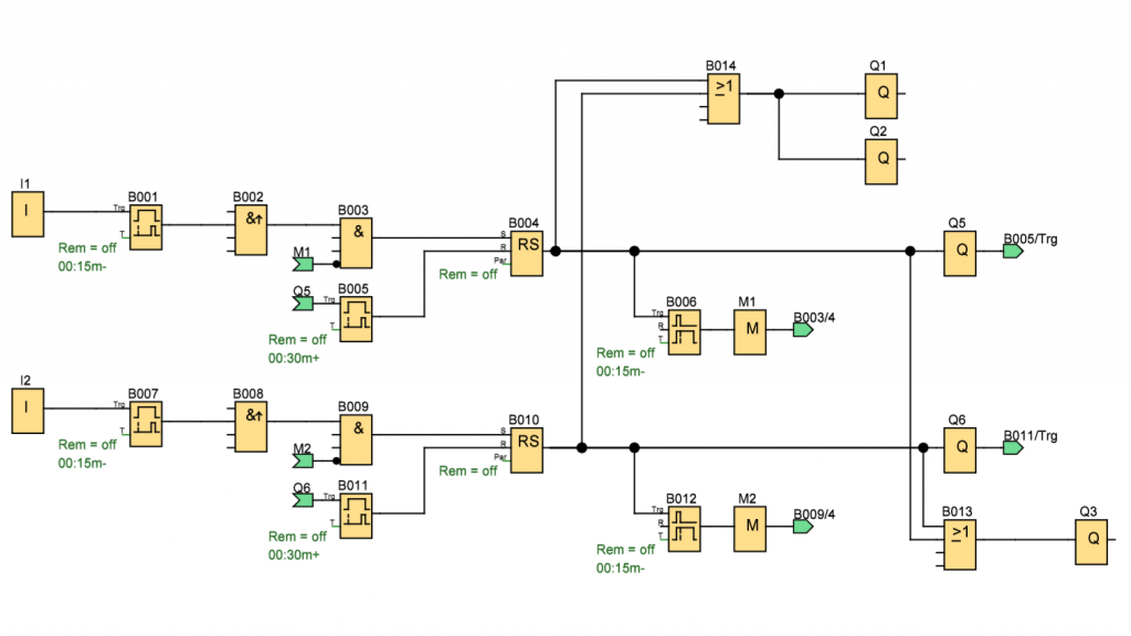 A programnak úgy kell működnie, hogy ha valamelyik érzékelő jelet ad a Logo!nak, akkor bekapcsolja a Ventilátort és az Elszívó ventilátort, ezen kívül bekapcsolja a hozzá tartozó UV lámpát és a vákuumszívókát és elindít egy timert, ami a beállított idő után lekapcsolja őket. (UV, szívóka, ventilátor, elszívó). Miközben megy az egyik számláló és jelet ad egy másik érzékelő, akkor bekapcsolja a hozzá tartozó lámpát/szívókát és ez is elindít egy timert. Ha közben lejár az első akkor az csak az UV/szívókát kapcsolja ki, a ventilátor/elszívó csak akkor kapcsol ki ha a 2. számláló is lejárt.
