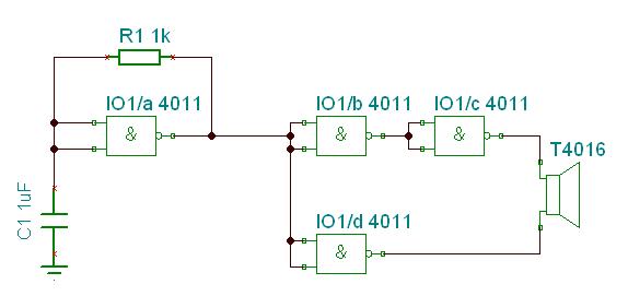 Ez egy 1 ellenütemű digitális erősítő. A bejövő jelet IC1A invertálja ... elválasztja az előző fokozattól , tehermentesíti a meghajtó port lábat . IC1B : mint inverter van használva , ezáltal lesz ellenütemű a rendszer. Mivel előtte lévő jelet is visszük tovább és az általa invertált jel további fokozatra kerül. IC1C és IC1D : BUFFER Mivel párhuzamosan vannak kapcsolva akkor a kimeneti terhelhetőségük növekszik "teljesítmény" erősítőnek foghatóak fel a NEGÁLT jelúton. IC1E IC1F : BUFFER Hasonlóan mint az előző 2 kapu csak ezek a PONÁLT (értsd : nem negált (nagyon leegyszerűsitve a fogalom magyarázat) ) jelutat erősítik. C1 : DC leválasztást biztosít nem fogja egyen feszültség a sugárzó piezzóját folyamatosan feszíteni.