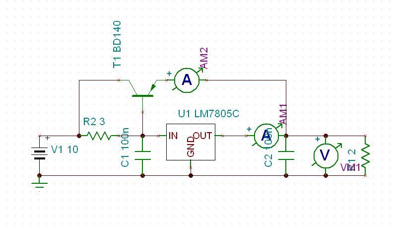Sziasztok! A feszültség stabilizátor ic 1A áramánál többre lenne szükségem. Találtam egy kapcsolást ami elvileg ilyesmit tud, de a szimulátor szerint bőven 1A fölé engedi az áramot az ic-n. hogy is kéne csinálnom. Egy 7806-al kellene 3A-es tápegység.