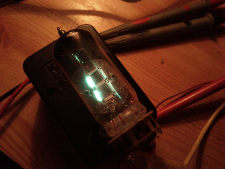 Állítgattam egy kicsit a tápfeszeken és ilyen lett. Amit csatolok képen a fűtés 1,38V, az anódfesz pedig 24V. A fűtőszál így, szabad szemmel nézve nem izzik, a fényerő között sincs látható különbség 24V és 30V között.