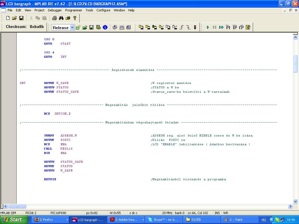 MOVWF W_TEMP ;Copy W to TEMP register SWAPF STATUS,W ;Swap status to be saved into W CLRF STATUS ;bank 0, regardless of current bank, Clears IRP,RP1,RP0 MOVWF STATUS_TEMP ;Save status to bank zero STATUS_TEMP register : : ISR) ;(Insert user code here): : SWAPF STATUS_TEMP,W ;Swap STATUS_TEMP register into W ;(sets bank to original state) MOVWF STATUS ;Move W into STATUS register SWAPF W_TEMP,F ;Swap W_TEMP SWAPF W_TEMP,W ;Swap W_TEMP into W A STATUS_TEMP és W_TEMP regisztereknek a 0x70-0x7F memóriaterületen foglalj le helyet, máshol nem lesz jó!