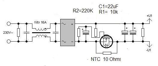 3-400W-ig elég egy 4,7 ohmos NTC magában, 6-700W-ra párhuzamosan szoktam kötni kettőt, felette meg relé.
