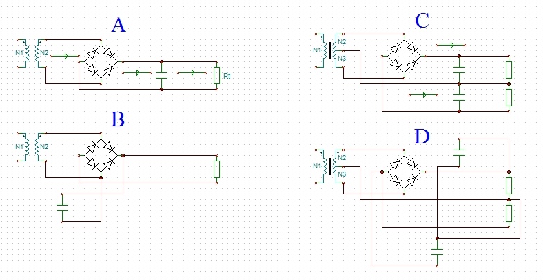 A pufferekről. Ahhoz, hogy a kondenzátorok elláthassák a feladatukat az A ábra szerint kell bekötni őket. Tehát a trafó szekunder feszültsége a diódákon keresztül megjelenik a kondin, majd innét megy tovább a terhelésre (ami lehet bármi, vezérlés stb.). A nyákodon a B ábra szerint van bekötve, vagyis rosszul. Ez igaz a primer pufferre is, annak a bekötése is csak részben jó. A szekunder oldalon ugyanez a helyzet, annak a C ábra szerint kellene kinézni, a nyákodon viszont a D ábra szerint néz ki.