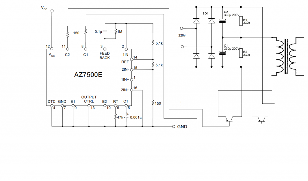Találtam egy értelmesebb IC-t: AZ7500EP. Ezzel már meg tudom valósítani amit szeretnék, megrajzoltam a kapcsolást. Megtennén nekem valaki hogy ránéz, hogy működni fog-e ez így? Esetleg a tranzisztorok elé lehet hogy kéne valami leválasztás azt meg tudom oldani trafóval ha kell. Adatlap