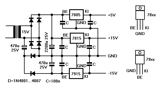 A trafónak 230/15V-os min.15, de inkább 20VA-esnek kell lennie. (15V 2x0,2A = 6VA és az 5V 0,6A-nél is 15Vx0,6A = 9VA-rel kell számolni, amiből 6W veszteség. Ez alakul hővé a 7805-ön, tehát szép hűtőbordát igényel, ha ezt ki is használod) A 100nF-os kondik helye a stab IC-k lábaihoz minél közelebb legyenek és ügyelj a negatív stab IC eltérő bekötésére is: GND, BE, KI a sorrend. A 7805 melegedését csökkentheted, ha a bemenetével sorbakötsz egy (régi?) kerékpár-izzót, ami 6V 3W. Ez teljes fénnyel fog világítani fél A terhelésnél,miközben 6V-tal kevesebb jut az IC-nek. A hűtőfelület megfeleződik, és még fényt is kapsz, ami majdnem olyan jó, mint egy mA-mérő: kis gyakorlattal megítélhető a kimeneti áram... A hozzászólás módosítva: Jan 3, 2013