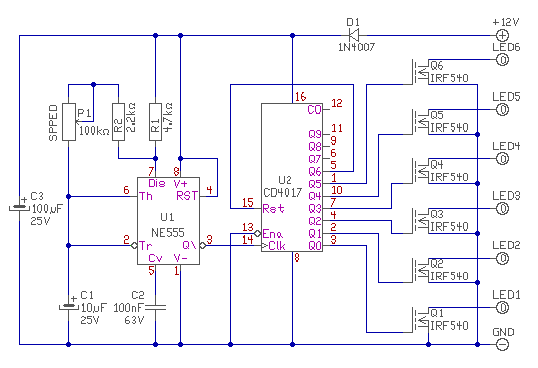 Hajdanában is ezzel kezdtük a futófény készítését, most megrajzoltam. A Ledeket sorba kötheted addig, míg a tápfesz megengedi. Én fehér esetén 3db-ot tennék sorba. Lehet sárgával négyet is lehet. A sort úgy folytatod, ahogy lerajzoltam. A sornak 4-el oszthatónak kell lenni, hogy a végén ne dadogjon. Természetesen minden Led-ággal a Fet Drain-nél még 10-et párhuzamosan köthetsz ugyan így. (3*4*10=120) Ha a kapcsolót bekapcsolod, égni fog az összes. De a tápnak 12V/1A kell tudni. üdv! proli007