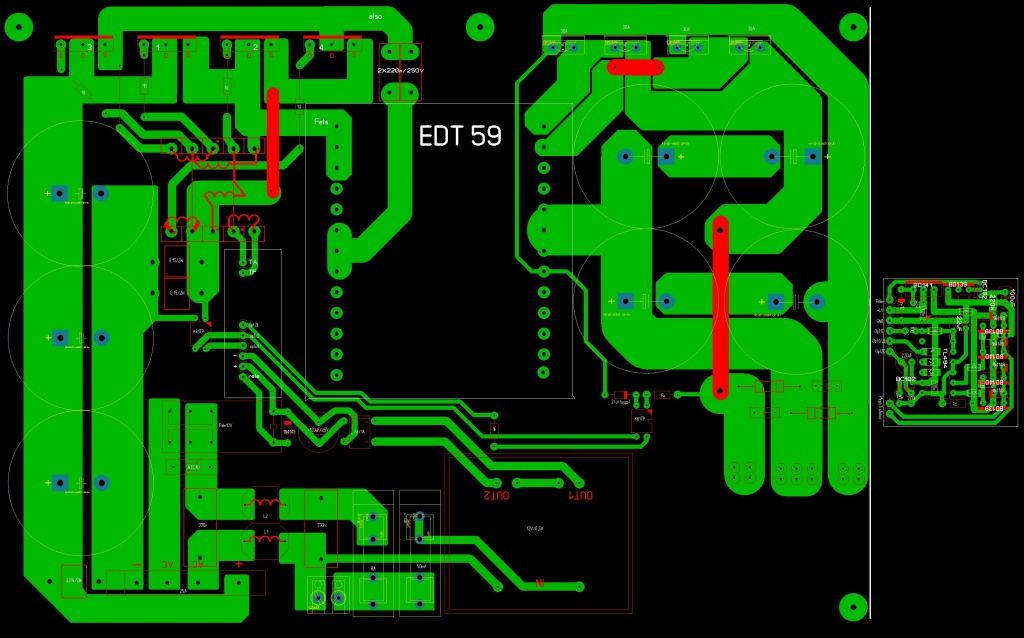 Először helyezd el úgy a végtranzisztorokat, hogy kényelmesen tudd a hűtőbordához fogatni. Innen visszafelé pakold fel szellősen az alkatrészeket ahogy a rajzon is elhelyezkednek. Rendezd valamennyire pofásra az alkatrészhalmazt. Most lehet a vezetősávokat berajzolni, szintén a végtranyóktól kiindulva. Közben változhat az alkatrészek helyzete, az egyszerűbb sávkialakítás érdekében.