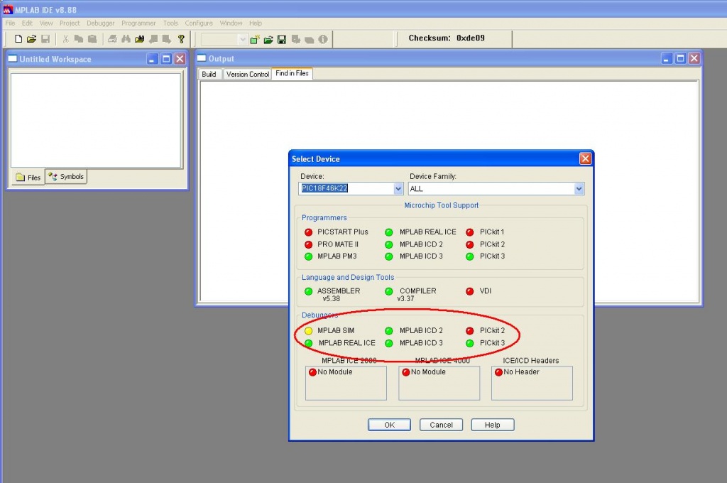Az MpLab nem tudja a 18F46K22 -t sem programozni sem nyomkövetni (programot felügyelettel futtatni a kontrollerben, megállítani törésponton, léptetni utasításonként, továbbindítani, a lépések között a változók megtekinthetőségét biztosítani). A PICKit2 V2.61 a PK2DeviceFile-1.62.14.dat állománnyal tudja programozni.