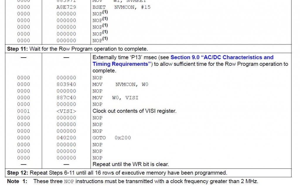 Köszönöm az értékelést... A tesztek még tartanak... Nem elég az újakat vizsgálni, arról is meg kell győződjek, hogy a többit nem rontottam el... Idézet: „A két problémás PIC-nél kevesebb NOP utasítás alacsonyabb frekvencián működhet, vagy szigorúan meg kell lennie mind az 5-nek?” Ha jól megnézed a belinkelt képet, máris találsz egy ellentmondást: 5 nop van megjelölve, de a note 1 kezdetén 3 -at említ "These three nop instructions". Ahogy kivettem a dokumentációkból, ezek a nop utasítások biztosítják az órajelet az előzőleg átadtott utasítás végrehajtásához. Valószínűleg kell a 3 * 24 db órajel impulzus és az összes időre vonatkozhat a korlát. A memória írás engedélyezésére lehet egy időablak. A PICKit2 képes lenne a kiadására, de a mostani firmware nem: Nem tiltja a megszakítást a kiléptetés alatt és minimum 12 utasítással valósít meg egy órajel impulzust. A módosítás sem egyszerű a script interpreter miatt. A NVMKEY regiszter beírását és az 5 (vagy 3 pontosan nem tudni) nop kiadását egy funkcióba kellene vinni. Sajnos nem is tudom tesztelni, mert csak soklábú SMD tokban forgalmazzák. Esetleg, aki képes a soklábú SMD tokokat kezelni, letesztelhetné... A hozzászólás módosítva: Jan 5, 2013
