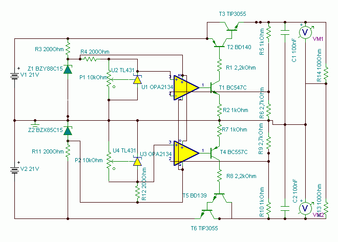 Sziasztok. Én anno Proli007-től kaptam egy szabályozható szimetrikus feszültség stabilizátor kapcsolást, amit egy kicsit átalakítottam. (A negatív ágban, is van TL431-es referencia.) A kérésem az, hogy nézzétek meg a kapcsolást legyetek szívesek, hogy jók e az ellenállás értékek benne, illetve egyáltalán. Áram korlát nincs benne. Tinában működik ugyan, de az csak egy program. Köszönöm.