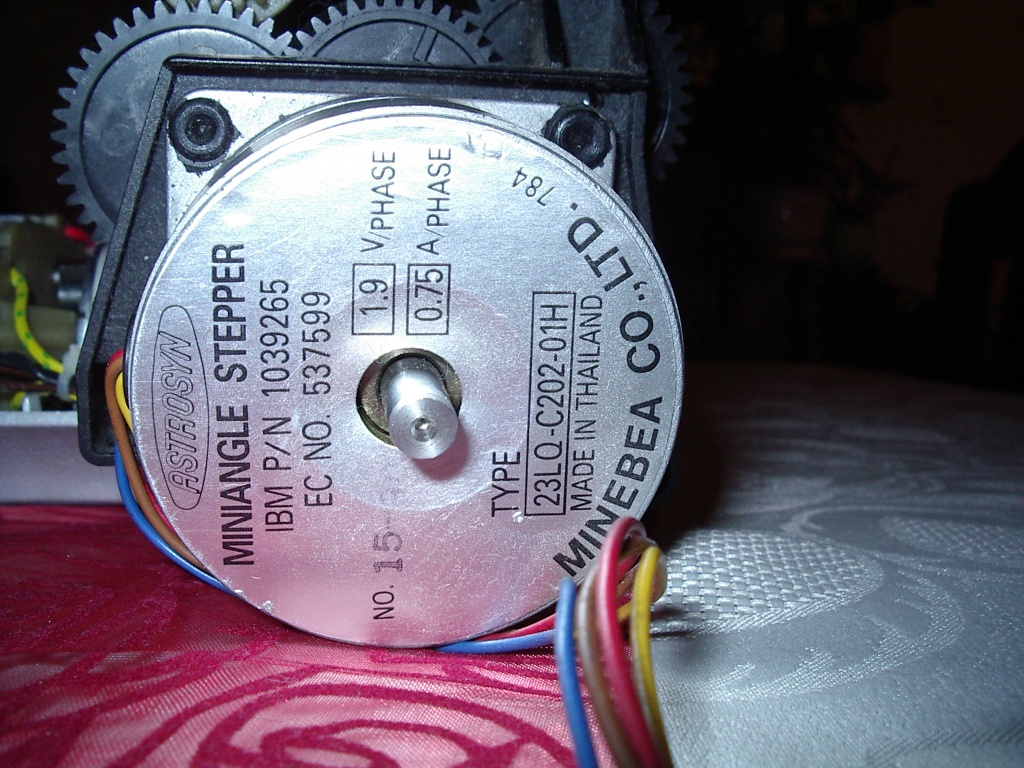 Leszedtem a motort. Bipoláris, 6 csatlakozós. 26V 60Ohm, egy lépés 3.75 fok. Elég picike jószág, max. 10W csúcsteljesítménnyel. Az a nagy bajom vele, hogy össze van hegesztve. Nem lehet szétszedni. Próbáltam találni helyette másikat a neten, de nincs olyan, ami hasonló lenne.
