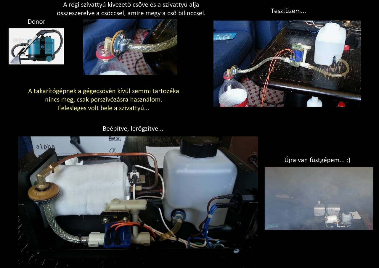 Hali! Én egy ipari gőzölős vasalónak a kazánjából építettem meg a füstgépet és egy ipari kávéfőző szivattyúja küldi bele a folyadékot .Szerintem elég jó lett felmelegszik szinte folyamatosan lehet neki tolni nem kell sokat várni hogy újra melegedjen 10-20 másodperc és már újra mehet .