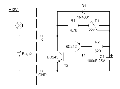 A késleltető úgy van bekötve, hogy meg van szakítva a test kapcsolóről az égőre menő vezeték. Külön tápfeszt nem igényel, tehát 2 ponton csatlakozik az áramkörbe. Ahány égőd van, annyi db áramkört építesz, és mind elé sorba kötöd. Arra vigyázz, hogy 5 W-osnál nagyobb izzót ne használj, hogy ne melegedjen nagyon az áramkör. Legyen BD243C, az bírja. Vagy ha van hely, akkor BD 245.