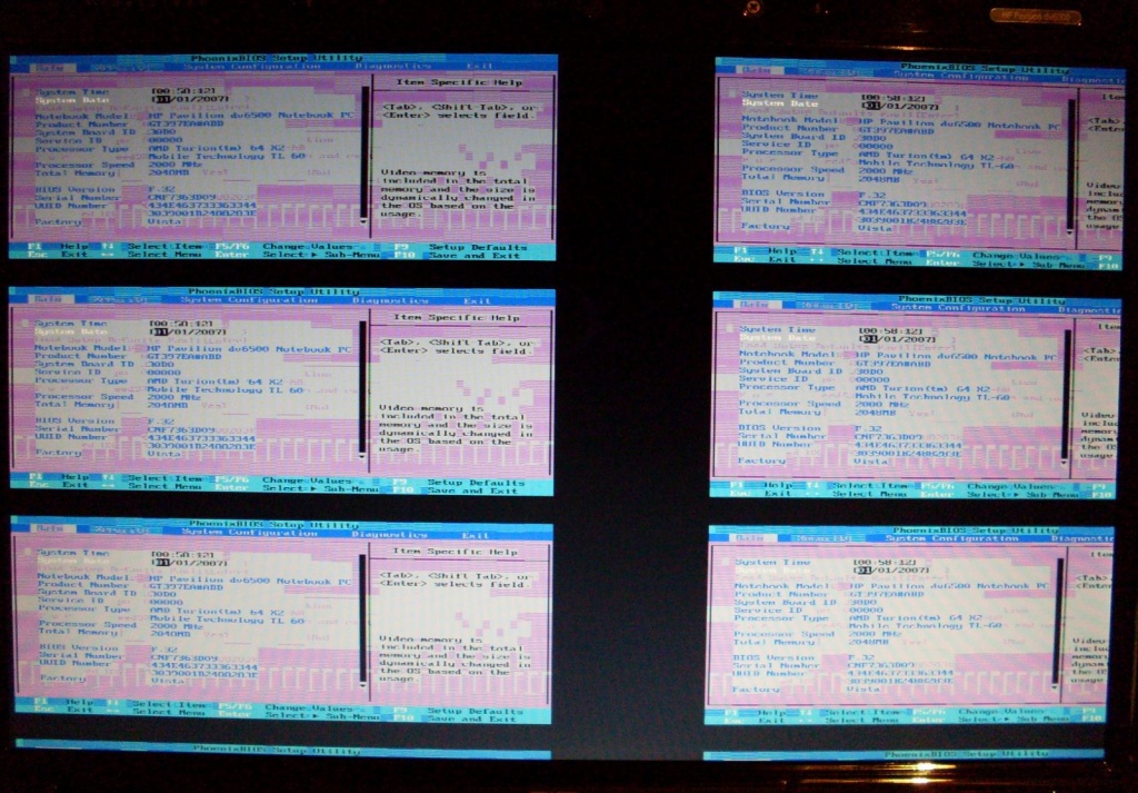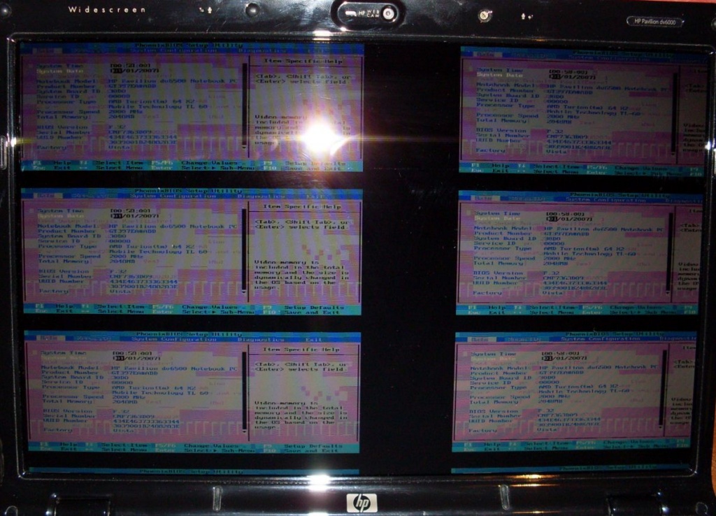 ![]() A típusa HP Pavilion DV6500: DV6551eg. Nincs benne winchester, de gondolom, ha tennék bele akkor is ez az osztott kép fogadna? Első indításkor is így több részletben "kissé elmosódottan" jelent meg a "HP színes kezdőkép". Majd továbblépett és szétcsúszott sorral írta ki a képen látható mondatot: "operating system not found". A második indításnál már tökéletesen olvashatóan írta ki ezeket a sorokat, nem voltak elcsúszva. Előtte beléptem a BIOS-ba és ez a kép fogadott, sajnos állítgatni nem igazán lehet, mert ahogy arrébb lépek egymásra csúsztat több "szellemképet", így nem mindig látni melyik opciókon vagyok éppen.
