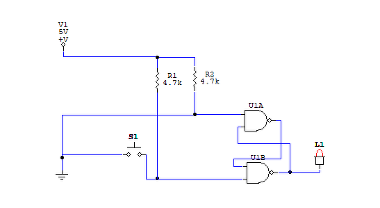 Láttam a nand kapu pergésmentesítőt, de viszont csak nyomóbombom lenne ezért a felső nand kapu kapcsolóra kötött lábát negatívra rákötöttem. A szimulációban működött, de ez a valóságban is jó működnifog?