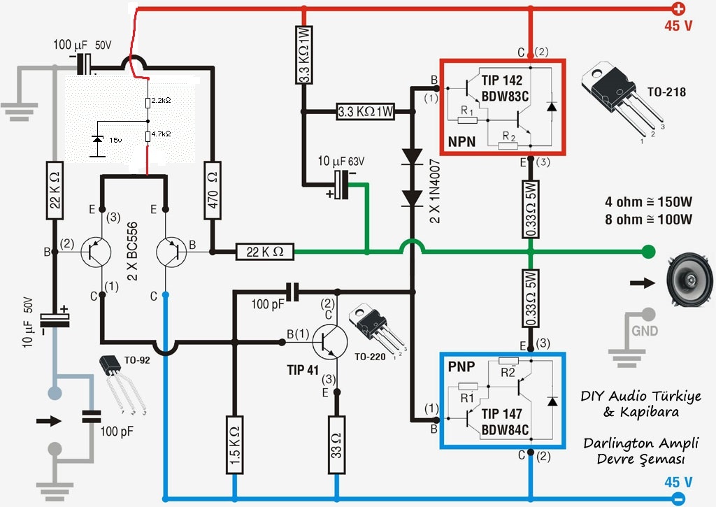 A végtranzisztorok kivételével minden pozícióba elvben megfelel a BC550C-BC560C párosítás, a kimeneti darlington mindenképpen minimálisan 3MHz FT legyen. A nyugalmi áram R21-el állítható, D5, D6 diódákat egyszerűen ragasszuk rá a végtranzisztorokra.