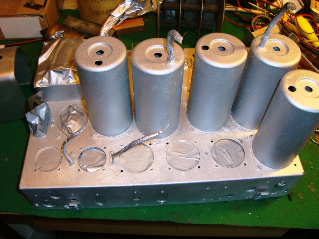 Folytatom a Lorenz felújítást. Egy régi mester "megpatkolta" az egyik csövet, hiába akkor még nem volt hőálló műgyanta, és így javította a levált kivezetést. Egyenlőre rendbehoztam a csövet, nem tudom, hogy jó-e. Kimaszkoltam és lefújtam a penelt is, az éjjel száradt, most elkezdhetem visszaépíteni a cuccokat. Csináltam prespán burkolatot két új elkóhoz, hogy hasonlítson a régire, mert az szakadt, majd ez lesz visszarakva.