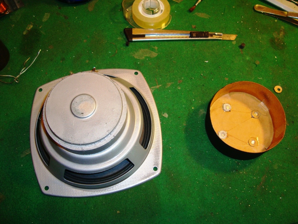 Folytatom a Lorenz felújítást. Mind előzőleg írtam a rádióban nem volt hangszóró, de még a falap, ami tartja az is hiányzott. Először egy megfelelően régi hangszórót próbáltam felkutatni, de vagy nem volt méret, vagy nagyon gyenge volt már a mágnese, amiket találtam. Ezért úgy gondoltam, hogy a meglevő viszonylag kis kimenő teljesítményt nem kéne tovább rontani egy gyenge hangszóróval, hanem teszek bele egy modernebb báriumferrit-mágneses hangszórót. A 15 cm-VT találtatott erre a célra a legjobbnak, csak az a baj, hogy kinézetre nagyon elüt a régi készüléktől. Ezért lefújtam ezüsttel, meg csináltam a mágnesre egy papír-prespán burkolatot, és raktam rá "kamu" 4 rézcsavart. Most talán valamivel régebbinek néz ki és megnyertem a jó hatásfokot, meg a nagyobb hangerőt. Jelenleg itt tartok, de lehet, ha így sem tetszik, beburkolom az egészet vászonba, mint ahogy a régi rádiókban van.