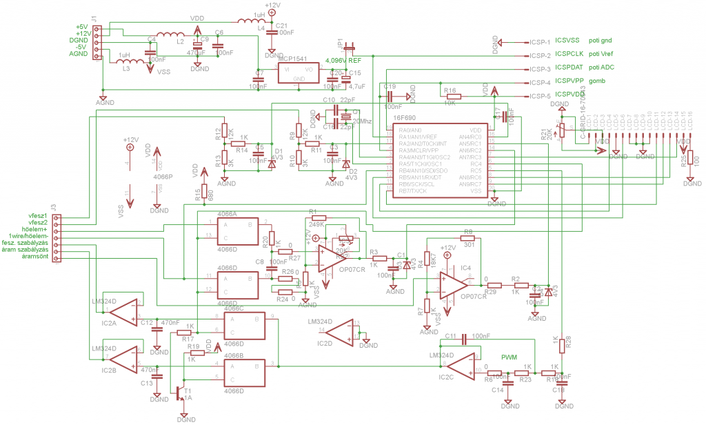 Jól gondolom hogy lábspórolás végett van ez az alapjel kapcsolgatás? Illetve persze azért mert csak egy PWM modulja van a felhasznált PIC16F690-nek. Olyannyira spóroltál hogy még az ICSP csatit is hadra fogtad. Így sokkal-sokkal nehezebb lesz szerintem a debuggolás. Miért nem választottál inkább egy több lábú típust aminek két PWM modulja van? A vezérlés is sokkal egyszerűbb lenne, csak beírod a CCPRx regiszterbe a kívánt kimenő feszültséghez vagy áramhoz tartozó értéket és kész. Az analóg szabályozókör meg elvégzi a többit.